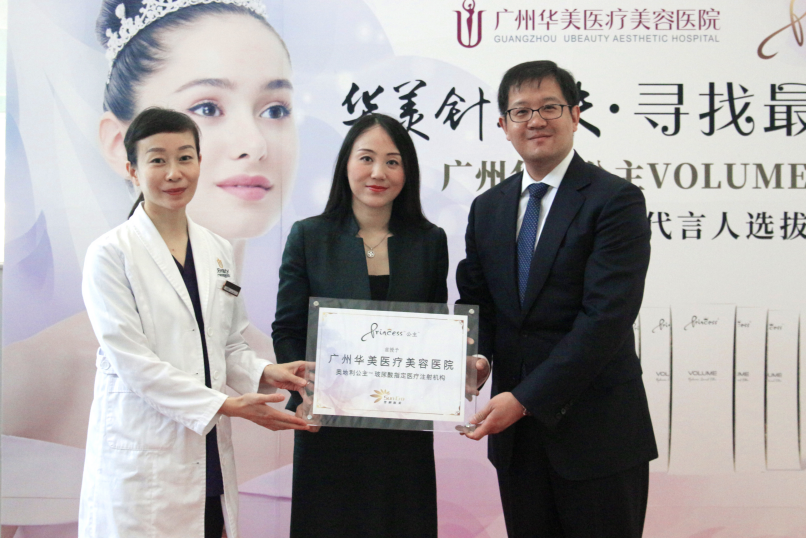 “美丽的艺术,华美的技术”,广州华美一直致力于以医美技术为中国女性带来美丽。过硬的医疗技术和坚实的医疗团队得到Princess公主玻尿酸官方一致认可,Princess公主玻尿酸官司方负责人秦海峰先生授予广州华美医疗美容医院“奥地利公主玻尿酸指定医疗注射机构”荣誉,同时,授予业界知名 “华美针功夫”名医团队代表广州华美医疗美容医院副院长赵晶晶女士,广州华美医疗美容医院注射主任苏亮先生,广州华美医疗美容医院注射主任朱葛勇先生“奥地利公主玻尿酸指定注射医师”荣誉。