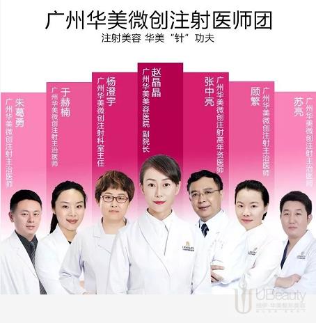 广州华美“针”功夫医师团由中国注射美容高级导师赵晶晶领衔杨澄宇主任、张中亮主任、顾繁主任、朱葛勇主任、苏亮主任、于赫楠主任等,所有注射美容医师必须拥有十年以上的注射临床实践经验,注射案例至少10万例以上。必须是正规医学院毕业,必须具备《医师资格证》《执业医师证》,必须经过3-5年、若干课时的注射高级培训课程,如美国艾尔建(乔雅登和BOTOX)中华区医师培训会、高德美(瑞蓝)医学美容技能培训会、爱贝芙注射医师高级培训会等,每年参加由中国医师协会美容与整形医师分会、激光亚专业委员会、微创抗衰老亚专业委员会主办的激光美容与注射美容大会,学习、吸收前沿的微创美容理论及技术。