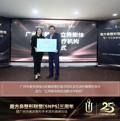 尤其是对于经欧盟CE认证的立秀膨体,其适应症广泛、软硬度及型号丰富、安全稳定性能等方面都具备无可比拟的优势,被誉为国内假体填充、鼻整形材料的之选,因而收获了医师与患者的共同青睐。广州华美医疗美容医院作为率先引进立秀膨体的机构,在立秀膨体的应用上累计了众多的成功案例,有着成熟的材料应用机制。叶明董事长作为中国医用膨体材料的创始人和领导、立秀膨体研发的领创者,基于对广州华美强大医师团队及医疗安全制度的认可,授予广州华美为“立秀膨体指定战略合作机构”。