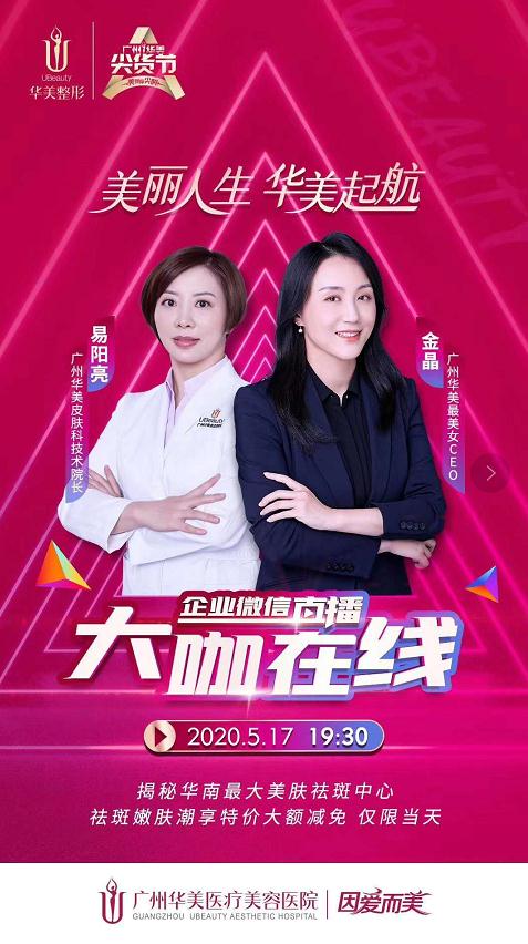 更震撼的是医美界CEO也要“提枪上阵”为自家医疗美容医院带货了!5月17日晚七点半广州华美医疗美容医院最美CEO金晶女士携手华美皮肤科技术院长易阳亮于企业微信上开播啦,一位是拥有最高定价权的CEO,也就是说通过直播间直接买货的观众,可以享受到比平时更优惠的产品;一位是拥有大量专业美肤祛斑知识皮肤科技术院长,也就是说在直播间观看的人,可以了解到大量的美肤祛斑知识。总结来讲,这次直播可以说是大咖在线“发钱”,享受优惠的同时,还能学到东西。广州华美医疗美容医院的美女CEO金晶女士表示:华南祛斑看华美!我将带大家走进整个华南美肤祛斑中心,全面见识美肤祛斑仪器!让所有观众不仅能买到更优惠的美肤产品,更能收获满满的护肤干货!